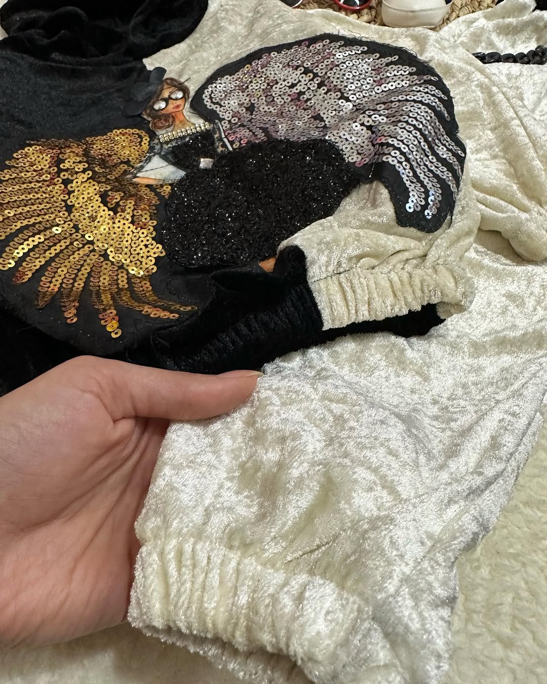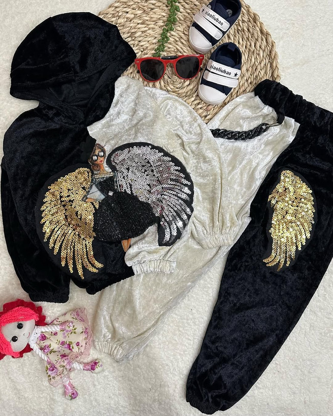 ست هودی و شلوار فرشته بالدار با پولک دوزی شده و زنجیر، شلوار جدا میشود. جنس مخمل با کیفیت عالی.